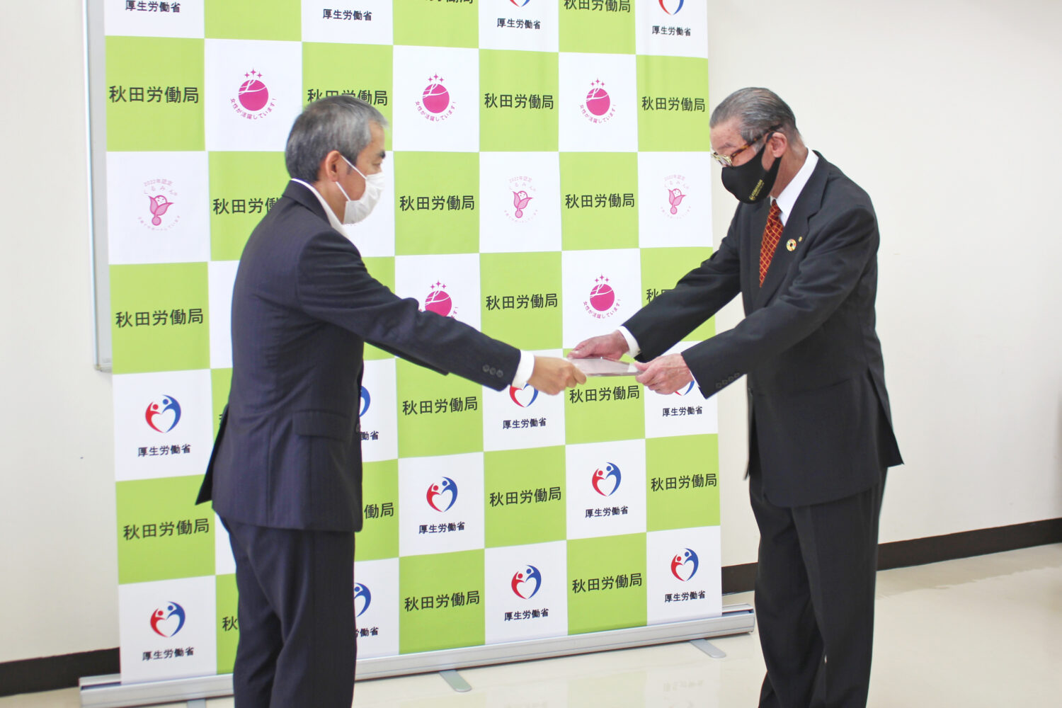 8月31日、秋田市の秋田合同庁舎で行われた認定通知書交付式には、小林工業株式会社の小林憲一郎 代表取締役社長と小林恭 取締役副社長、土井一哉 総務グループリーダーが参加しました。秋田労働局の川口秀人 局長が小林憲一郎 代表取締役社長にくるみん認定通知書とえるぼし認定通知書を手渡しました。