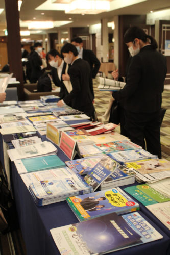 会場内では、企業の説明を真剣に聞く姿や、説明時間の合間に、資料コーナーで各企業のパンフレットを手に取って見る姿が見られました。