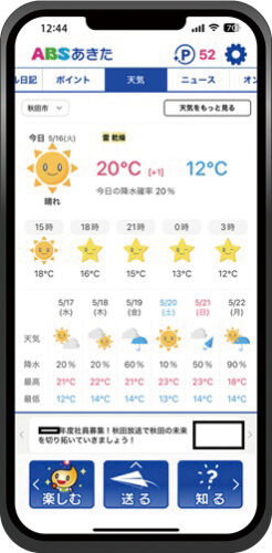 「ABSあきたアプリ」や公式YouTubeチャンネルでも、県内のニュースや天気、グルメ、スポーツなど、暮らしに役立つ情報を発信しています。重大ニュースや地震情報、大雨などの気象情報はアプリのプッシュ通知で速報。公式YouTubeでは中学・高校総体や少年野球のライブ配信を行うなど、それぞれの強みを生かし、地域に密着した情報を届けます。