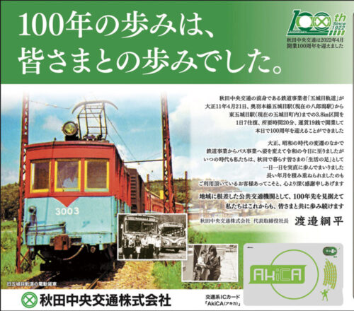 2022年4月21日で開業100周年を迎えた「秋田中央交通」。時代の変遷のなかで、鉄道事業からバス事業へ転換。2022年からは、交通系ICカードが利用可能に。2024年7月には、WEB検索サービス「バス来るTIME」を開始。今後も、お客様のニーズに合わせ進化を続けます。