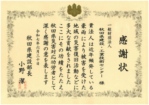 近年多発する自然災害の復旧活動に取り組み、災害対応功労者として秋田県から感謝状を授与。地域の暮らしを全力で支えています。