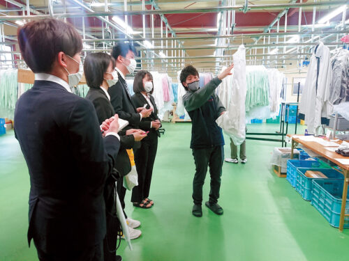 自分に最も適した関連業務で活躍できます。業務内容は、リネン営業、介護営業、生産工場、配送、資材管理、事務、リネンキーパーなど多岐にわたり、さまざまな経験を積むことが可能。県内外の研修に参加しながら実力をつけ、一人ひとりの「得意」を生かして働くことができます。