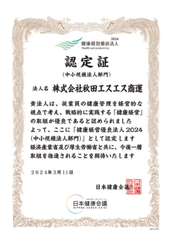 すべての業務で“安全”を最優先に考え、ドライバーへのサポート体制や安全管理を徹底。「安全優良事業所(Gマーク)」に認定されています。また社員の健康維持・増進に積極的に取り組むため、「健康経営」を宣言。特に優良な健康経営を実践する法人を認定する、検証制度「健康経営優良法人」にも認定されています。