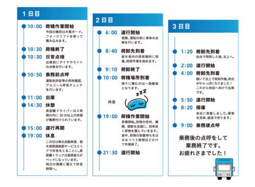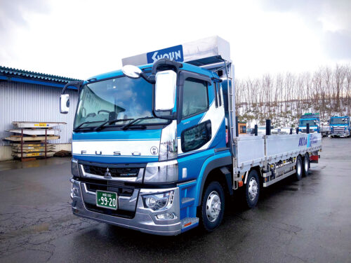 「ウィング車」は、秋田県内の合板、製材、米、鋳物などの積荷を、関東、東海へ運搬。その帰りに、一般雑貨(日用品など)を積み、仙台、盛岡、秋田方面へ運搬します。