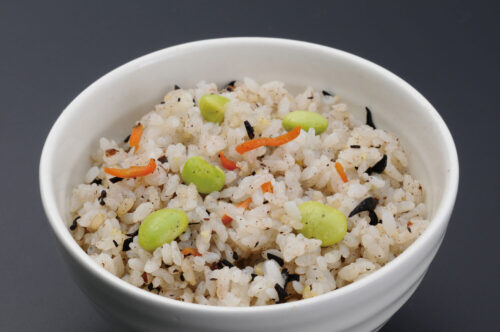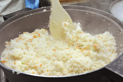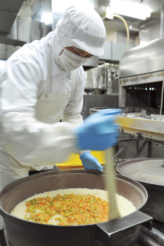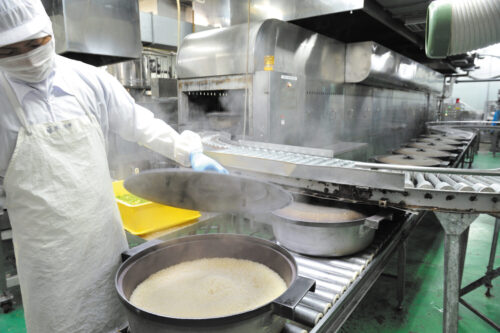 食品事業部では、敷地内の米穀事業部で精米された国産米を、その日のうちに使用します。天然地下水を使って直火丸釜で炊き、米飯を中心とした冷凍食品を製造。安全のため、材料選び、異物混入防止、温度管理などの品質管理を徹底しています。