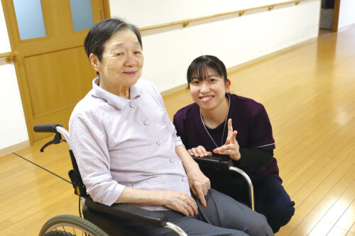 離床・食事・トイレ・入浴介助など身の回りのケアを担当。先輩を見習いながら、自分なりの方法で、一人ひとりに合わせた距離感や価値観を尊重しています。