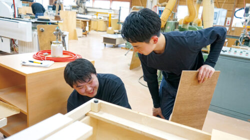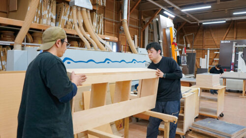 職場体験で美しい曲線の加工を見て、当社なら木工職人の夢を実現できると入社しました。今は組み立てや仕上げを担当。納品先でその出来栄えを見た時の達成感は最高!