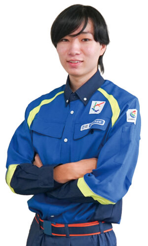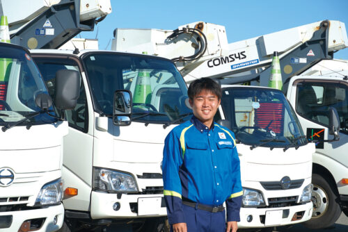 高所作業車で作業する高校の先輩にあこがれて入社。通信事業者設備の点検保守を担当しています。プライベートでは地元バドミントンチームでリフレッシュ。
