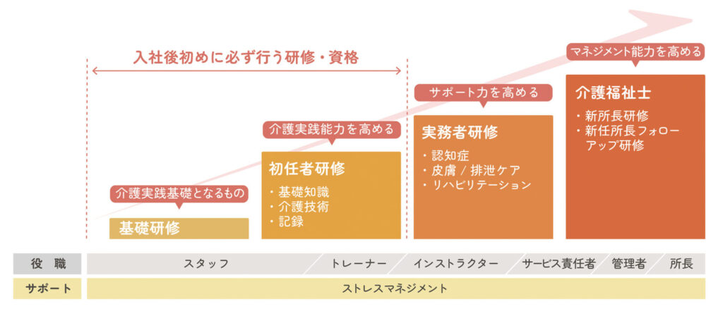 また、人材育成と福利厚生にも注力。介護人材が目指すキャリアへの支援と、ライフステージに合わせて働ける環境が整います。介護未経験者も働きながら、資格取得やキャリアアップが可能です。