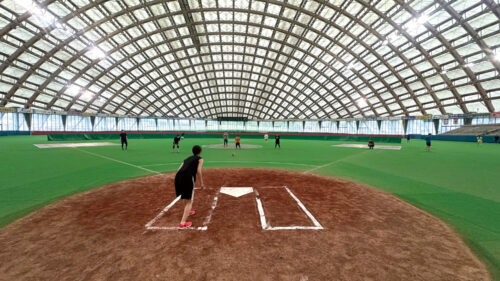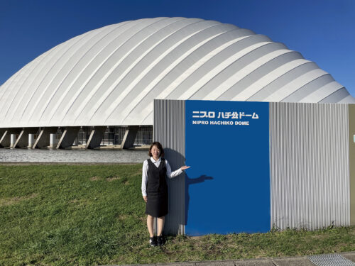 秋田県を代表するスポーツ施設「大館樹海ドーム」は、秋田杉を使った世界最大級の木造ドーム。2017年にネーミングライツパートナ−となり、呼称を「ニプロハチ公ドーム」と命名しました。社内イベントでキックベース大会を開催するなど、社員交流の場にもなっています。