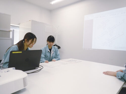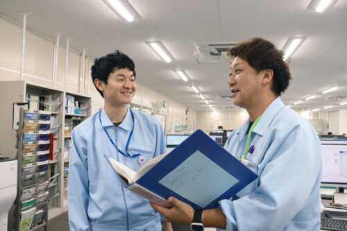 現場作業者の方々との対話を大切にしながら、製造課の全工程をチェック。現場課員が自分のことを覚えていてくださると、「仕事を見てもらえている」と感じ、励みになります。