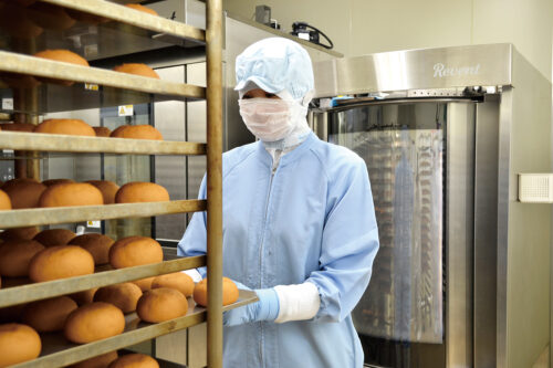 米粉のクッキーやパンの生地を製造。仕上がりの目視検査も行っています。特殊な機械の操作に初めは戸惑いましたが、できることや任されることが増えるとうれしいです。