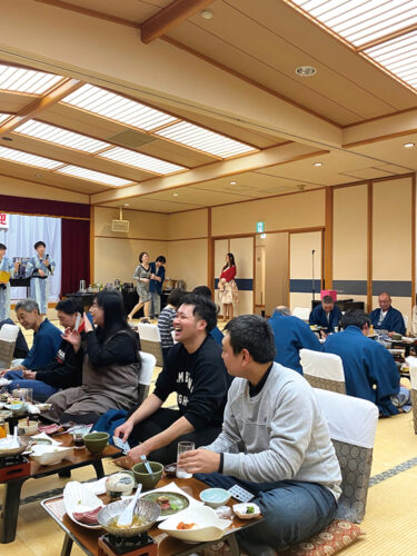 ごちそうを囲む交流会で、アフター5にリフレッシュ。部署を超えた従業員同士のコミュニケーションを楽しんでいます。また、若手従業員が組織する野球・ボート・駅伝チームがあり、毎年地域の大会に参加。さまざまな機会を通じて地域のみなさんとの親交を深めています。