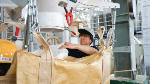 米の籾摺調製や袋詰めなどを行っています。作業をする際は怪我のないよう安全第一! 入社してから、米を販売するまでに数々の手間と苦労がかかっていることを知りました。