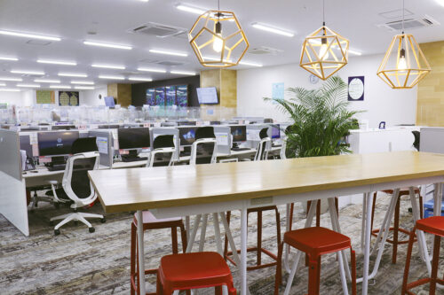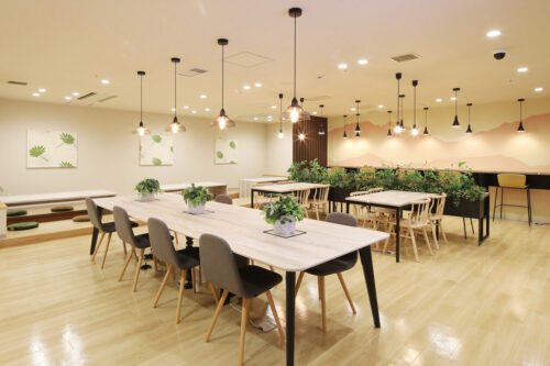 2Fには、おしゃれなカフェ風の休憩室があります。その名も「Wood Lounge」。木のぬくもりが感じられる明るく広々とした空間に、無料の給茶機やフリーWi-Fi、各席コンセントも完備! 休憩時間はしっかりリフレッシュし、メリハリをつけて仕事に取り組めます。
