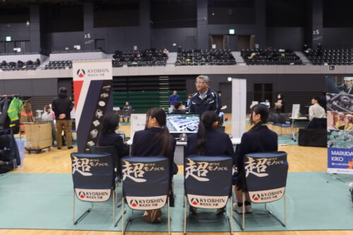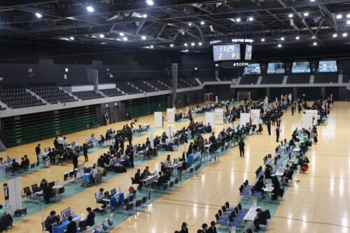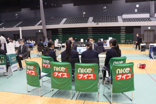 会場内では、急ぎ足で希望企業のブースを巡りつつ、配布資料や企業紹介動画に目を通し、担当者の説明に真剣に向き合う学生の姿が多く見受けられました。
