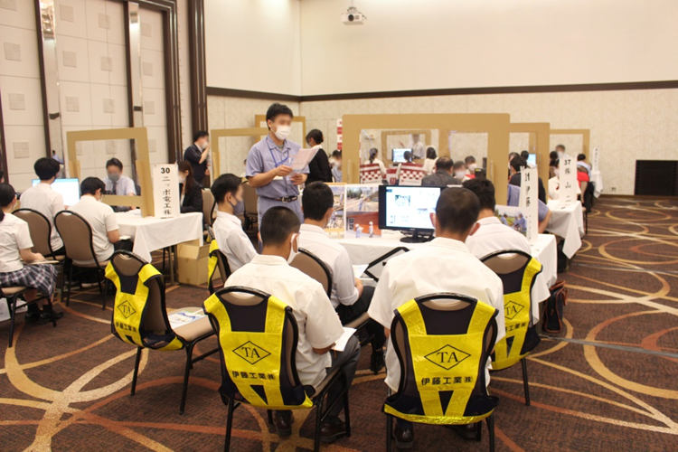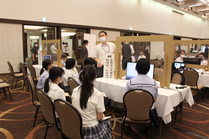 午前午後のそれぞれ、前半に「企業PR」や「社会人からのメッセージ」の就職促進セミナーが行われ、後半の情報交換会では企業担当者と生徒との間に飛沫防止シートが設置されたほか、各ブースの人数制限を設けて行われました。