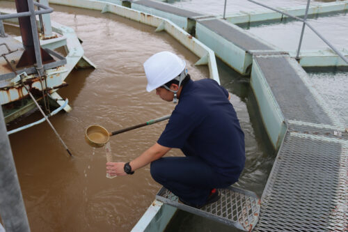 水処理工程の定期点検と、各ポンプ場のメンテナンスを担当。たくさんの機械があり名前や点検方法を覚えるのは大変ですが、早く一人でできるようになりたいです!