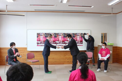 また、生徒たちより「試合を見るのを楽しみにしています」と、水野社長と須田社長に御礼のイラストフレームが贈呈されました。