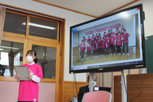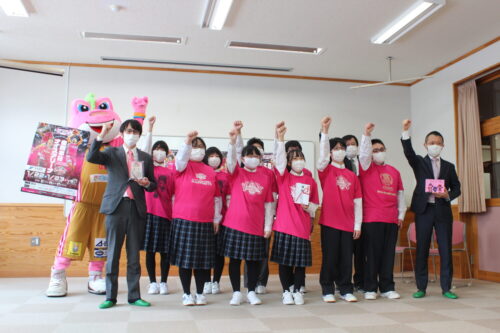 また、試合当日に会場の大型ビジョンで放映する「秋田県民歌の歌唱VTR」を流し、代表生徒は「これまでニュースなどでハピネッツの試合を見てきたが、実際の試合を見るのは初めてなので、楽しみ。そのハピネッツの試合で自分たちの歌う県民歌が流れるのも楽しみです」と喜び溢れる表情で挨拶しました。